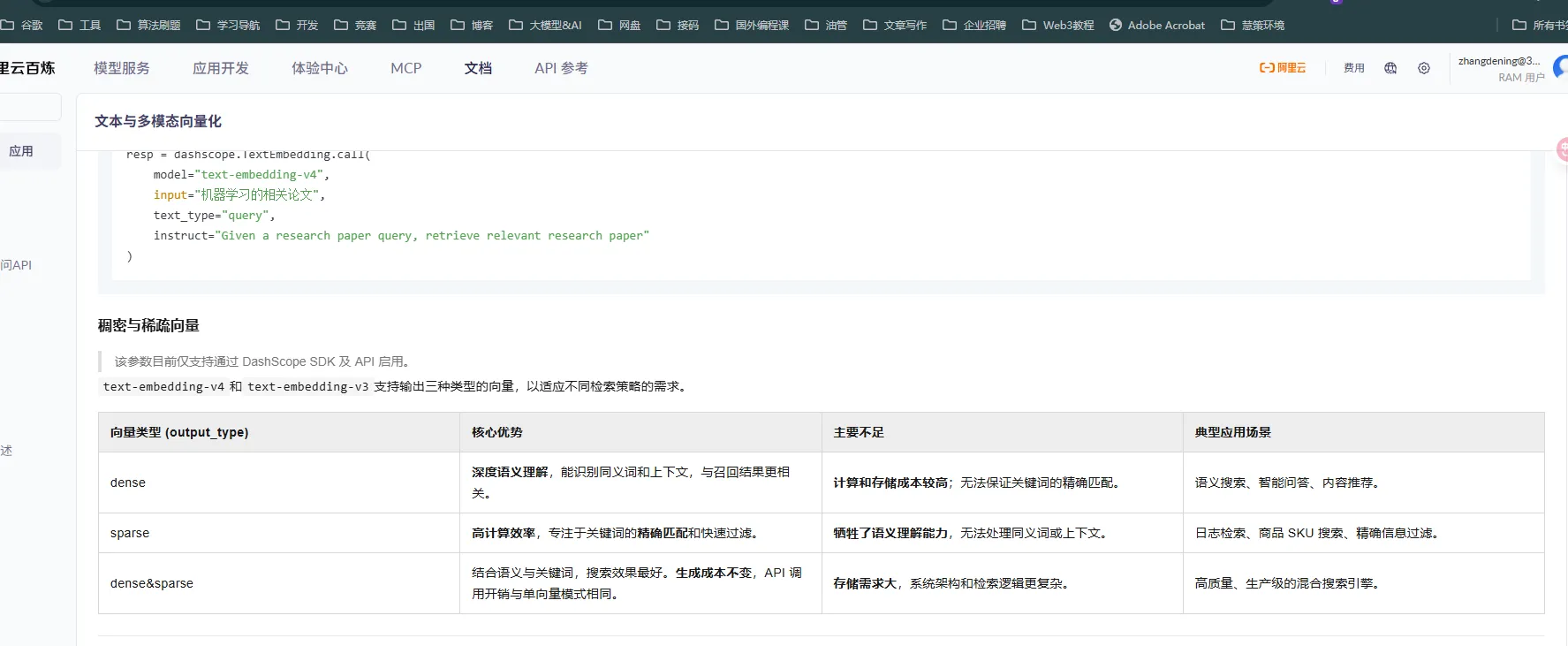 首先要实现混合检索,需要拥有将文本转换为稠密向量和稀疏向量的方法。阿里百炼提供的向量模型text-embedding-v4就支持将文本向量化为稀疏向量和稠密向量(默认)。通过官方SDK调用时,只需控制参数:**output_type**来确定接口返回稀疏向量还是稠密向量。文档:https://bailian.console.aliyun.com/?tab=doc#/doc/?type=model&url=2842587